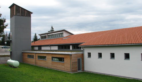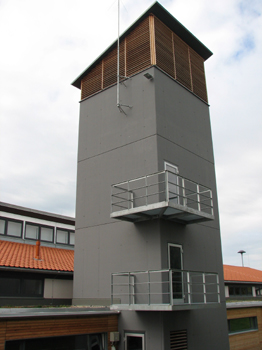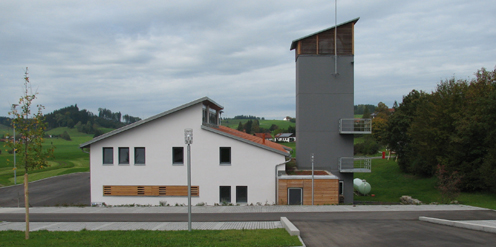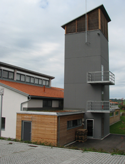 Der markanteste Teil des Gerätehauses ist der anthrazitfarbene Schlauchturm. Er ist mit zwei Balkone ausgerüstet, die für Übungen gut genützt werden können. Damit die darin aufgehängten Schläuche gut trocknen können, ist der Turm oben nur mit Holzlamellen verkleidet.
