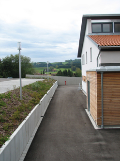 Der östlich gelegene Sozialbau ist durch zwei Durchgänge mit der Fahrzeughalle verbunden. Im Einsatzfall können die Feuerwehrmänner aber direkt durch die Türe an der ersten Garage in die Halle. Die großen Fenster lassen viel Licht in die Büros und Aufenthaltsräume.
