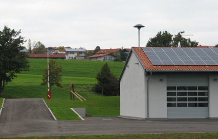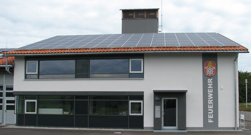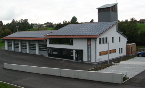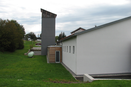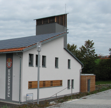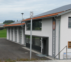 Das neue Heim prägt den westlichen Ortseingang vor allem durch die Fahrzeughallen und den modernen Schlauchturm. Dieser wird nachts blau beleuchtet.