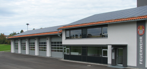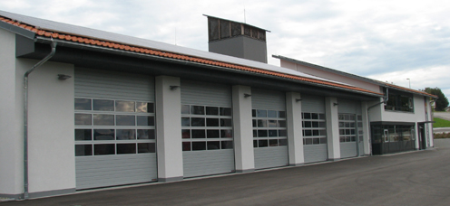 Südansicht des Feuerwehrhauses mit 5 Garagen für die Einsatzfahrzeuge und dem Sozialbau, sowie Schlauchturm.