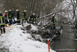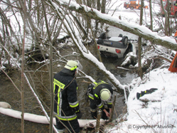 An der Einsatzstelle angekommen zeigte sich jedoch eine ganz andere Situation. Ein PKW lag im Flussbett auf dem Dach und war bereits beim Eintreffen der ersten Kräfte mit Wasser geflutet. Da zu diesem Zeitpunkt noch nicht bekannt war, ob sich noch jemand in dem mit ca. 3 ° kaltem Wasser gefülltem Auto befindet, war die Lage sehr angespannt. Durch diesen Anblick waren die Männer auf das Schlimmste vorbereitet.